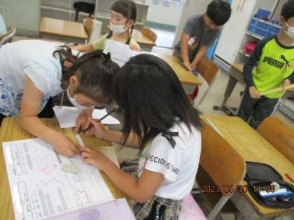 竹ざしで、色々な物の長さを測っています。cmとmm、2つの単位が出てくるのでややこしいです。