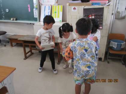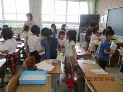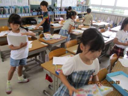 毎日、ワークやプリントなど、たくさんの提出物があります。先生の点検が終わった大量の配りものを、みんなで協力して配っています。名前をよく見て、配ってね。