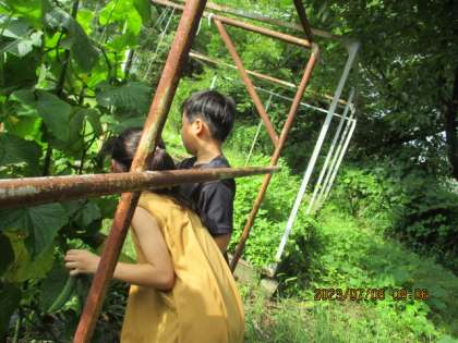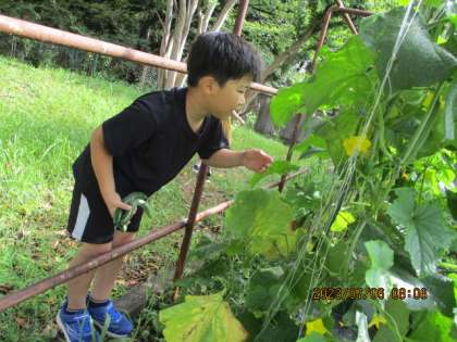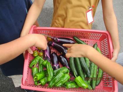 2年生の畑でたくさんの夏野菜が取れました。ちょっとした八百屋さんのようです。「きゅうりは3本でいくらにする?」「いやいや、1本50円です。」 やり取りが楽しいです。