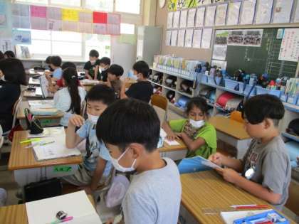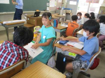 小数の学習です。1と0.1、0.01の関係について、近くの人と話し合っています。ノートに貼った図を見ながら自分の考えを説明しています。