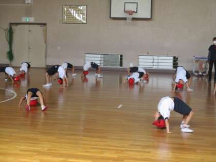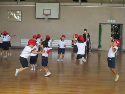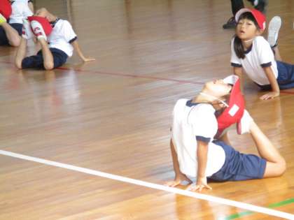 曲の雰囲気に合わせて体を動かしています。スキップしたり、ジャンプしたり自分で曲に合わせて動いています。柔軟性を高める運動も積み重ねています。