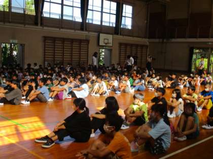 生活指導の先生からは、心や体がしんどいときには先生たちに伝えてねという話と2学期の生活目標などについて話がありました。