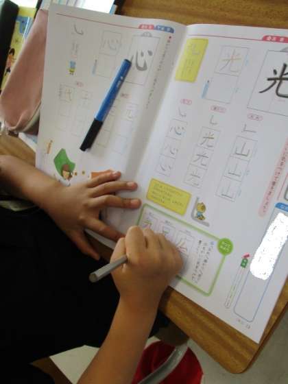 硬筆の学習です。折れや反りなどを学習していました。消しゴムはなるべく使わずにお手本を見て、落ち着いて書きましょう。
