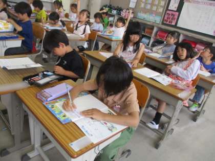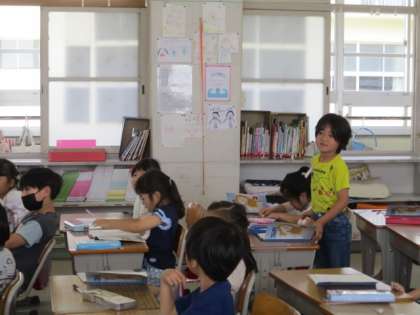 この時間は、たし算の文章題を学習していました。問題文の中から、大切な言葉を見つけていました。