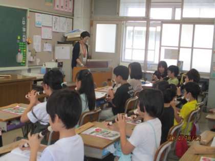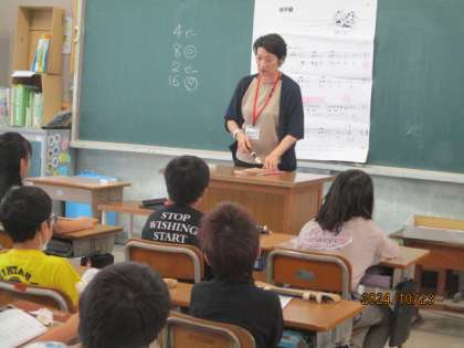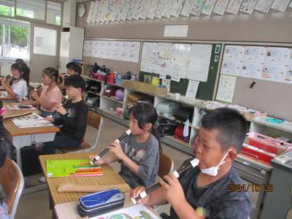 リコーダーの学習です。リコーダーの持ち方や姿勢を正しくして、きれいな音が聞こえてきました。