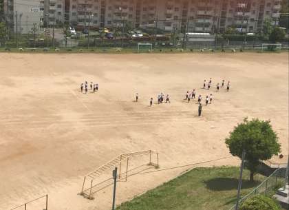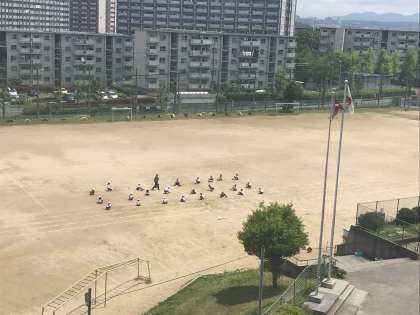晴れた空のもと、運動場でダンスの練習をしました。体形変換も見事です。