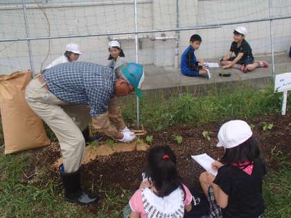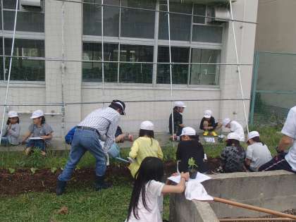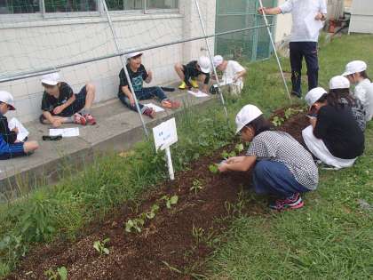 種から植えたきゅうりが,大きくなったので地域の方にお手伝いをしていただいて,畑に植え替えました。どんどん大きくなって立派なきゅうりに育ってね。
