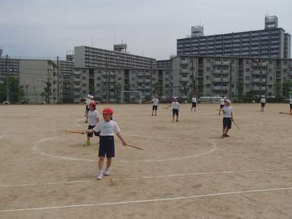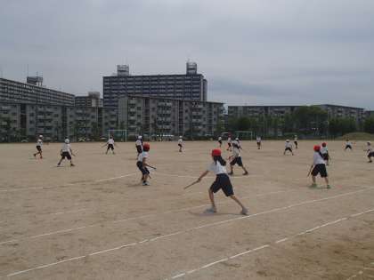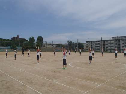 運動場でダンスの練習しました。広い運動場で元気いっぱい踊りました。