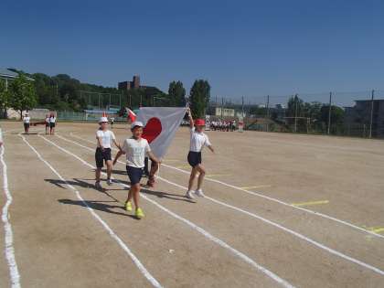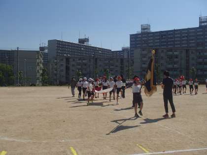第1回目の入場行進の練習でしたが,胸を張って,手の振りも大きく上手にできていました。その後,元気よく堺っ子体操もすることができました。
