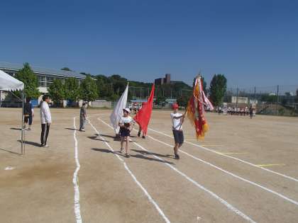 全体練習2日目です。今日は,入場行進と堺っ子体操の練習をしました。