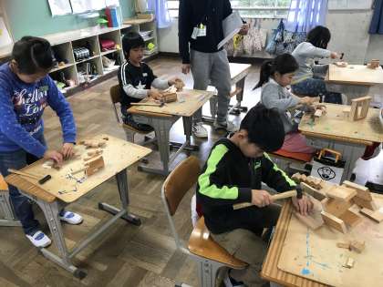 カナヅチを使って、木を組み合わせて作品を作っています。さて、何ができますかね。