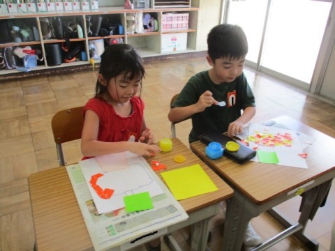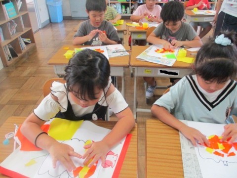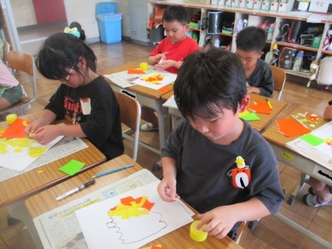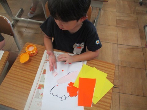 おりがみを使い、かぼちゃのちぎり絵をしました。