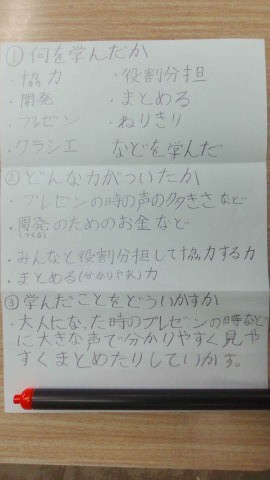 また、グループやクラスでの活動を通して、協力する力、役割分担する力、コミュニケーション力が大きく育ちました。初めは意見がまとまらなかったクラスも、話し合いを重ねる中で一つの目標に向かって協力し、知育菓子を完成させることができました。人の意見を受け入れ、支え合いながら進めることの大切さを、実体験として学ぶことができました。