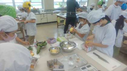家庭科の調理実習で「ゆでいもと青菜のおしたし」を作ります。