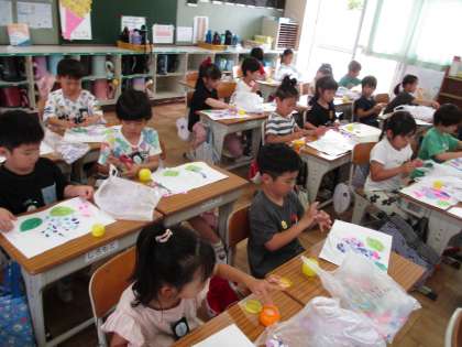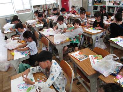 図工「あじさいとかたつむり」でみんなが楽しみにしていたあじさい作りに取り組みました。細かくちぎった色紙をぺたぺた・・・