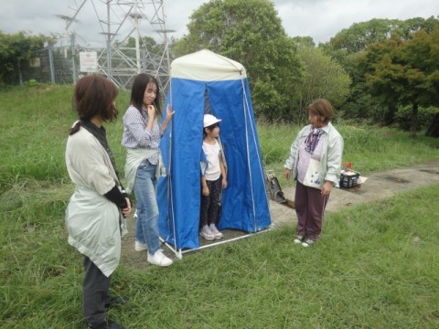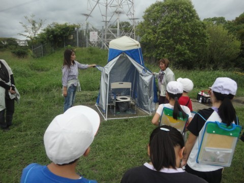 運動公園では、自宅で簡単にできる簡易トイレの作り方や使用方法、避難の時に一人が1日に飲み水をどれぐらい用意しておいたらよいか、飲み水は家では一か所に置かずに分散しておくことを学習しました。