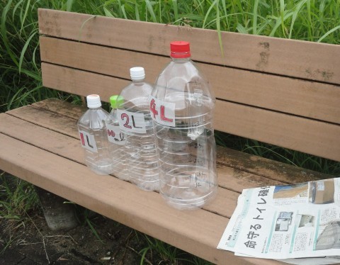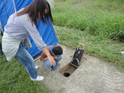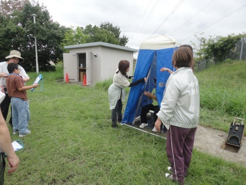 グランドでは、防災用トイレの説明と水の備えの大切さを教えていただきます(草刈りまでしていただきありがとうございました)