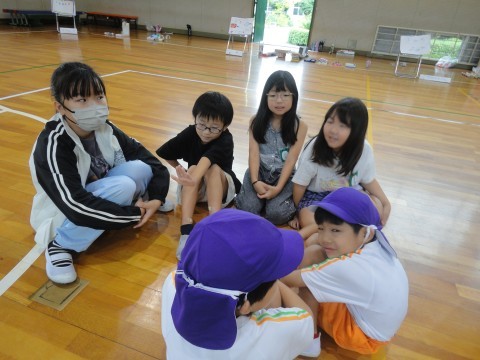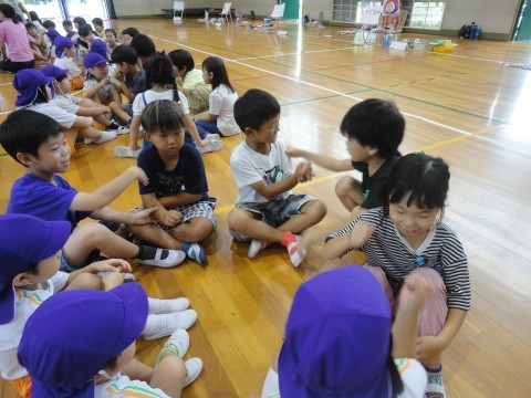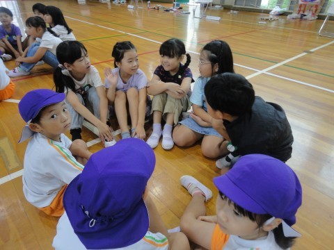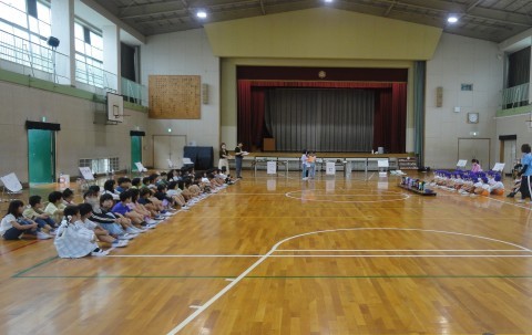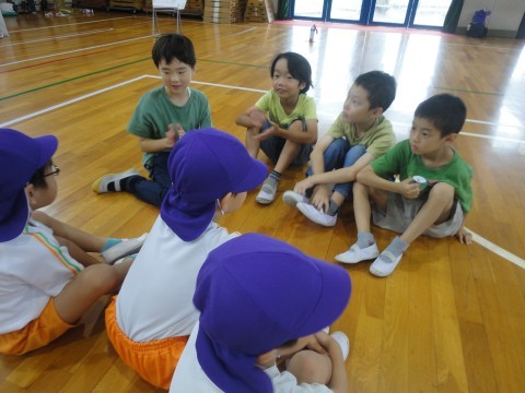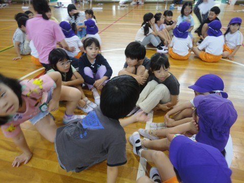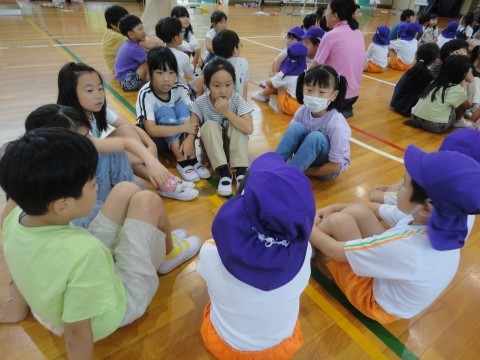 1枚めの写真のように、最初は緊張の空気が体育館に漂っており、こども園の年長さんも「緊張する どうしよう」と体育館に入る前に戸惑いの様子を見せていました。