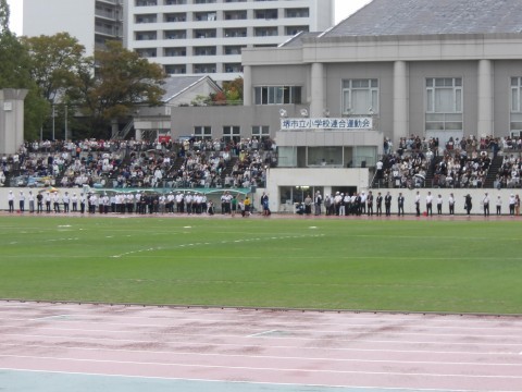 本番当日,堺市を代表し本校の児童が力強く選手宣誓をおこない,競技場のボルテージも高まり,一気に場の雰囲気が変わりました。