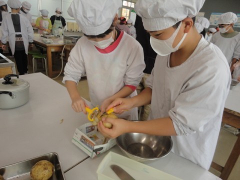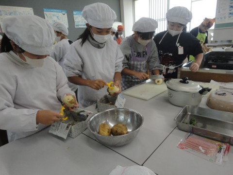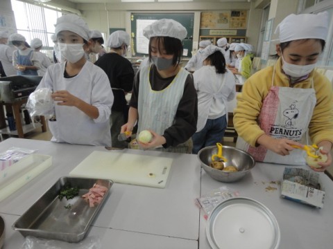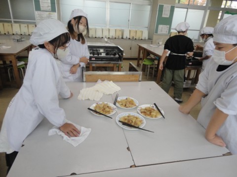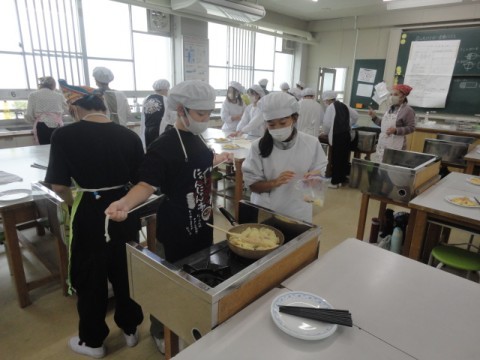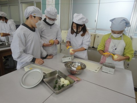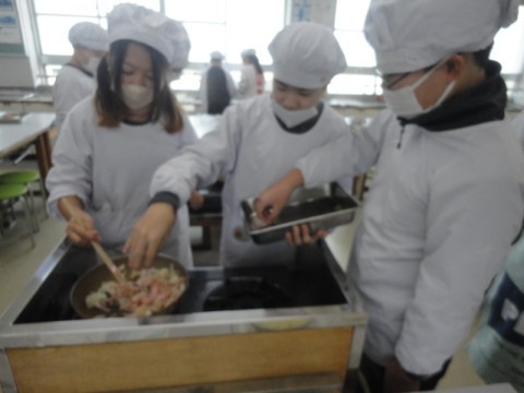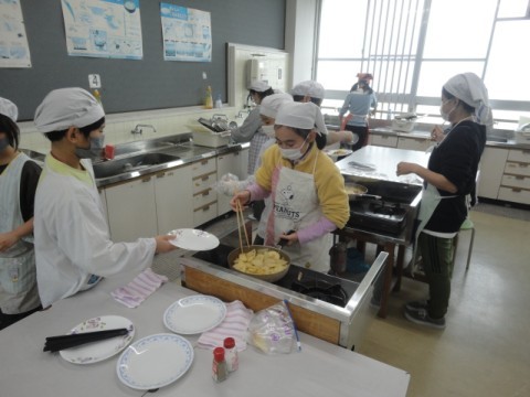 今日の3・4時間目に6年生が家庭科の授業の調理実習で野菜炒めをつくっていました。