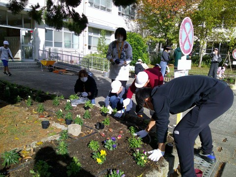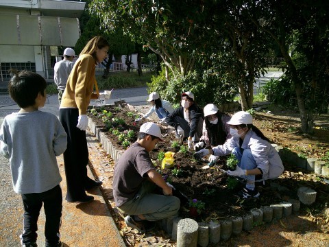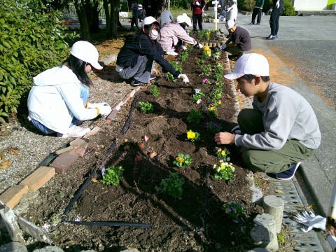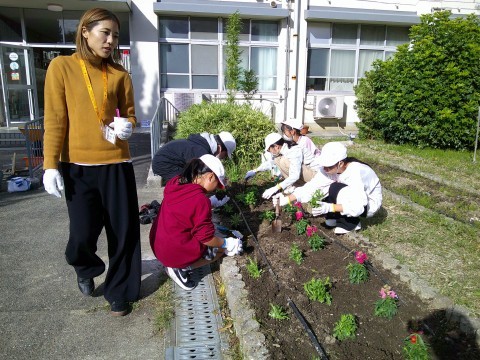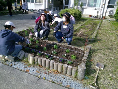 今日は,PTAの食と環境委員会の方々と児童の栽培委員が一緒になって花壇をきれいに整えてくれました。