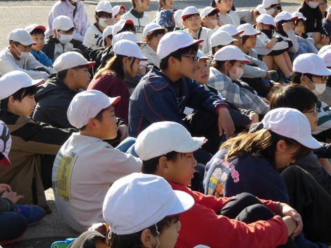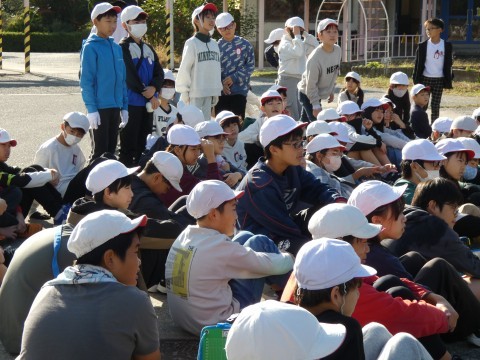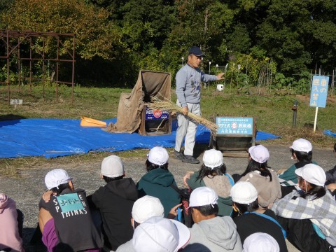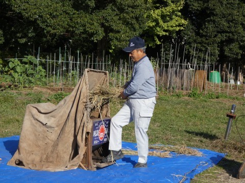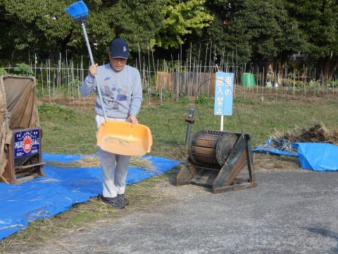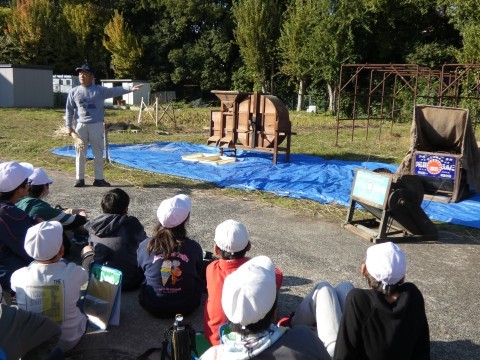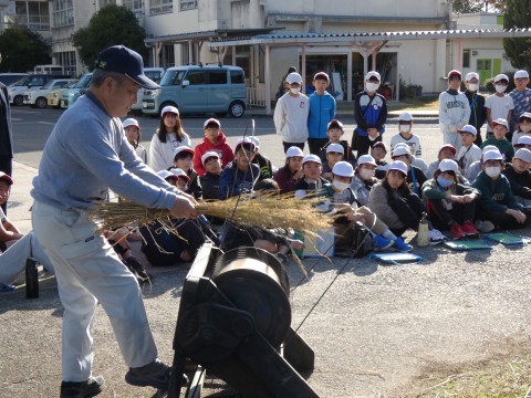 上神谷地区の登り山先生にお越しいただき,先日稲刈りをした稲で足踏み脱穀・もみすりを一緒に体験させていただきました。