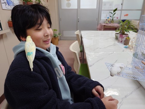 別の休み時間には,インコたちのお世話に来てくれる児童もいます。