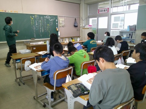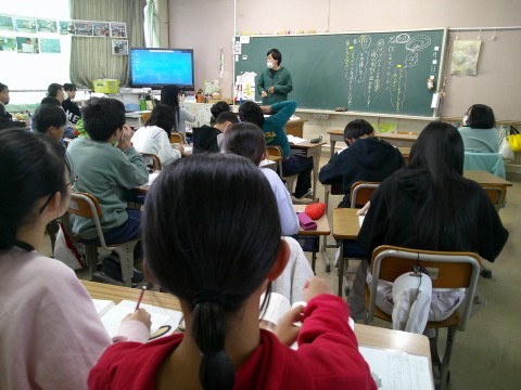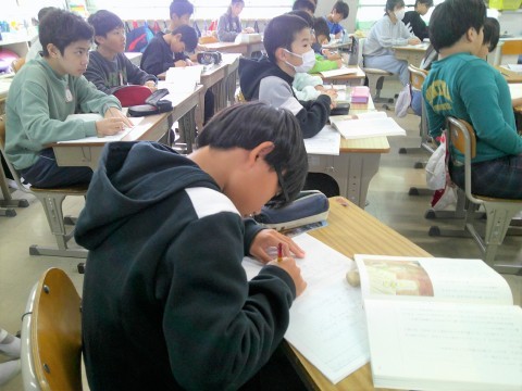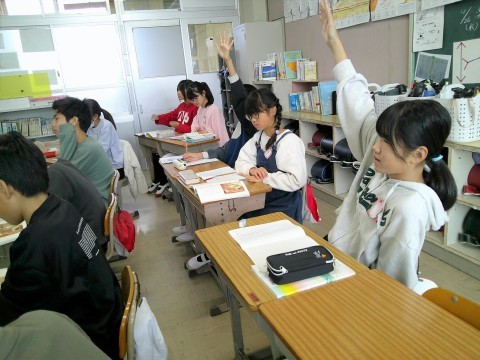 2組は国語で,ブック・ウーマンとの交流や心情の変化について読み深めていました。「家にこもりっきりの生活をしていた」という一文について,「なぜこもりっきりの生活が気にならないのか」考えています。本文にはない行間です。行間を読むことで物語の神髄に触れる楽しさもありますよ。みんなで意見を出し合ってね。