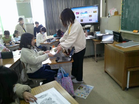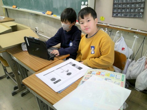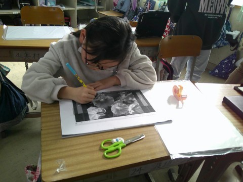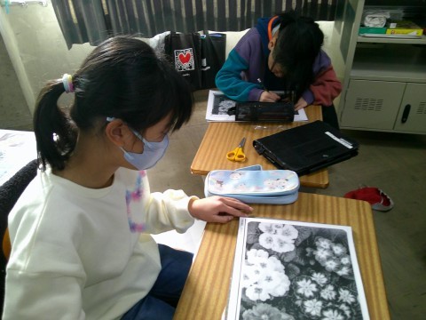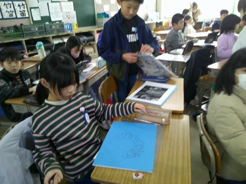 図工で版画をします。お花をテーマにして,デザインをしているところでした。