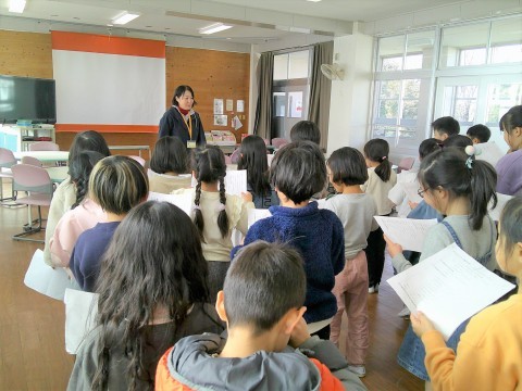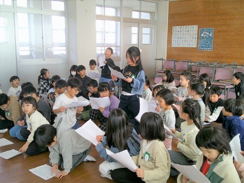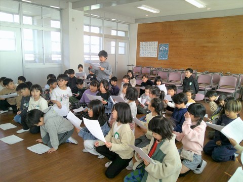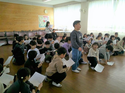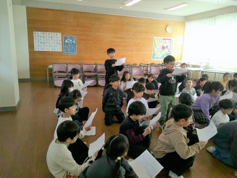 2年生 学習参観にむけて 公開日 2026/01/27 更新日 2026/01/27 2年生 2年生も5時間めに1・2組合同で学習参観にむけて取り組んでいました。スイミーの群読です。参観日は1・2組別々に行いますが,今日は合同でした。1・2組見せ合うことで,互いの刺激になり,明日からまたこうしよう!と思えたようです。2年生も盛りだくさんの内容ですが,こどもたちは「これもあれもおうちのひとに見てほしい!」と,とても楽しみにしており,今,取り組んでいます。 +5