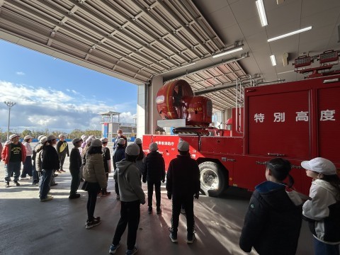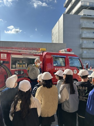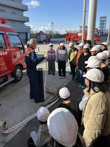 消防車に取り付けられているプロペラの役割について説明を受けたり、長さ20メートル、重さ約8キログラムのホースを実際に見せていただいたりするなど、貴重な学びの時間となりました。