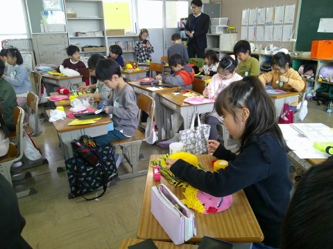 2年生の様子です。1組は鬼の面をつくっているところです。2組は,木曜日の参観で保護者の方に見ていただく群読に取り組んでいました。
