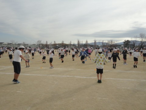最初に堺っ子体操をして体を温めてから,なわとびでいろいろな種類の跳び方をしました。