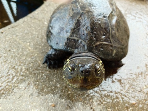 御池のカメさんも冬眠から目覚めてきました。まだ眠そうですが,また会いに行ってくださいね。名前はマイちゃんです。