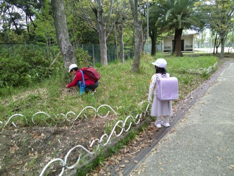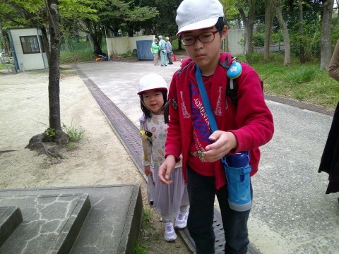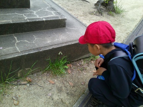 葉っぱがついていると思っていたら足が見えたので,さっそく通りかかった児童に声をかけるとじっと観察が始まりました。