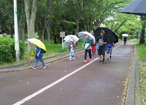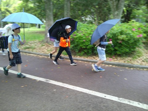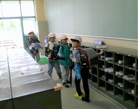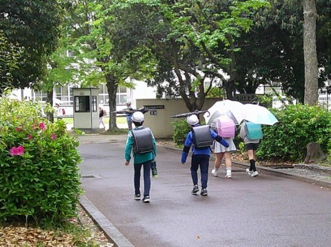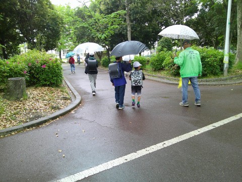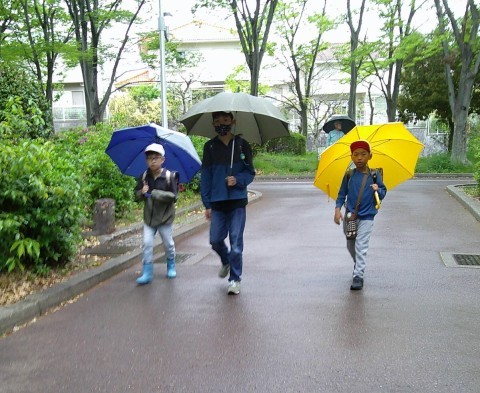 傘がないから・・・と一緒に入ってきた児童も。歩くペース,方向を合わせながら歩いていました。