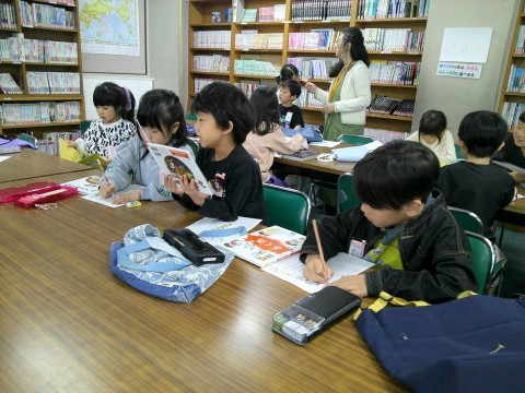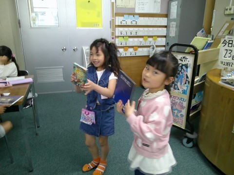 初めての図書の時間です。学校にはたくさんの本がありますね。