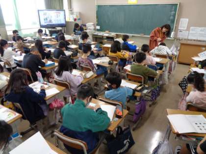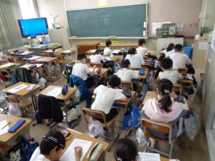 5の1は外国語の授業、5の2は2測定が終わった子から自己紹介目標設定シートの記入です。