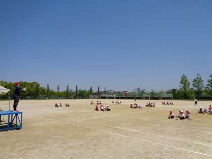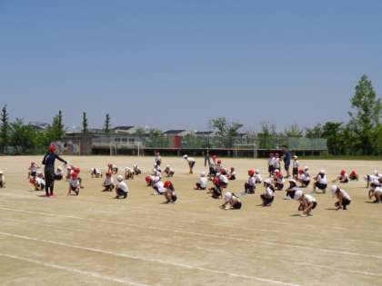1・2年生合同体育の様子です。体形移動の練習をしますが、どこにどれくらいの距離間隔で並ぶのかは難しいようです。これからの成長が楽しみです。
