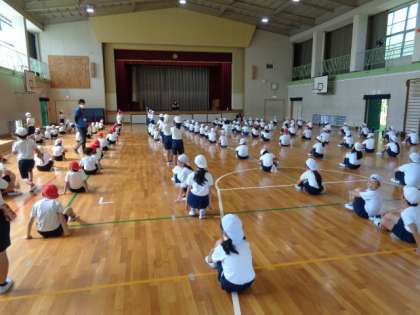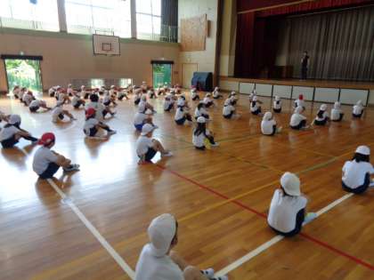 3・4年生はこの後運動場で体育大会団体演技の練習をする前に、日差しのない体育館で動きを確認します。