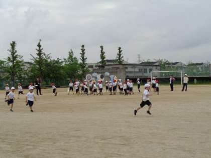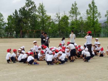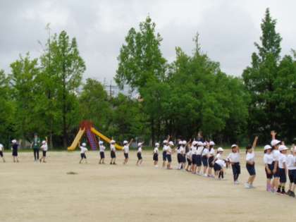 体育大会団体演技の練習です。だいぶまとまりができてきましたよ。練習の動きを振り返りながら、新しい技の工夫を話し合っています。