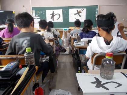4年1組は習字です。筆で書くのが難しいひらがなにチャレンジしています!