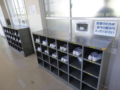 おまけの一枚は、音楽室前で美しく「そろった履き物」の靴箱です。