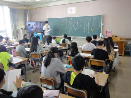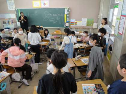 5の1は外国語の授業です。今日から新しい外国語の先生とNSの先生が来てくださっています