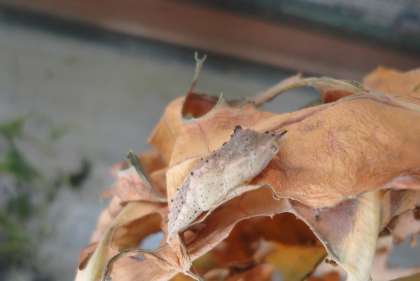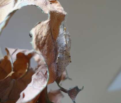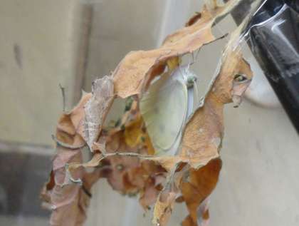 もうちょっとまっすぐに立たせてあげた方がいいと教えてもらい、サナギのついている葉っぱを飼育ケースに貼り付けました。