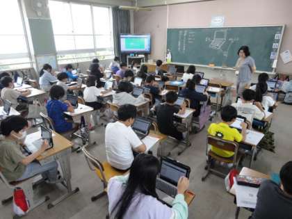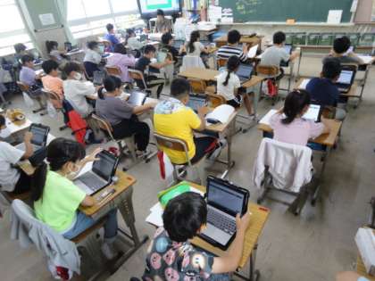 4年生はタブレットを使った学力調査です。タブレットの不具合、回線の不具合が多発して四苦八苦。