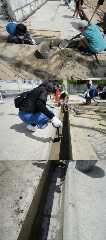 先日の大雨で、浸水してしまった昇降口前の側溝の土を上げました。