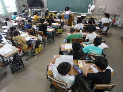 2の1は順番に体力柔軟テストをしながら、書き方の練習をしています。