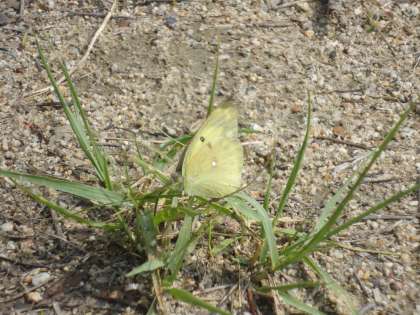 運動場で出会ったモンキチョウです。先日、博士から教えてもらったように全体が黄色かったです。