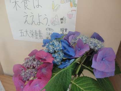 みんなが通る給食配膳室前と職員室に飾りました。それぞれ色が違うのでとてもきれいです。